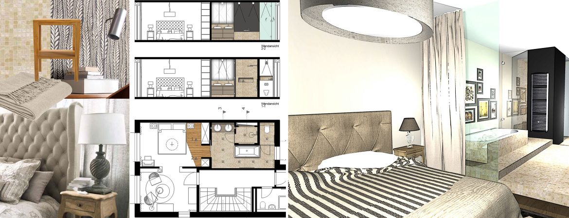 Interior design of a townhouse in the residential complex ‘Eldenaer Hoefen’ in Prenzlauer Berg, Berlin. The owners expressed desire for an interior design which is classic, modern and clear and this wish was fulfilled by VonSchoengestalt. The floorplan solution is clear and open; the master bathroom opens to the bedroom and wall panels divide the large bedroom into two areas. The materials and surfaces are all natural – fabrics in linen look, wallpaper as an eye-catcher and custom made furniture utilising oak veneer. Well-matched accessories complete the picture. The bathroom is dominated by mosaic tiles in beige nuances which serve to underline the natural noble character.